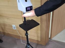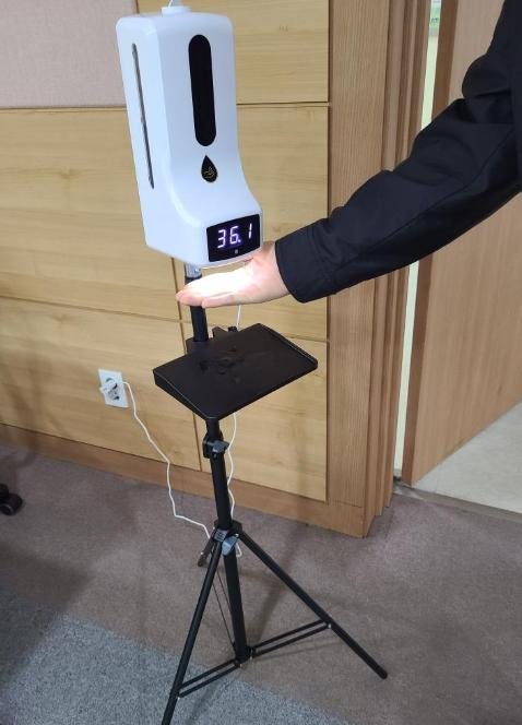이번 방역물품은 체온측정 자동 손소독기로, 손소독제 분사 시 적외선 센서가 작동돼 체온이 계기판에 표시되며 설정온도 이상일 경우 자동 경보가 울려 체온이 높은 사람에 대한 식별이 가능하다.