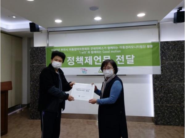 박화복 아동청소년과장은 “이제 첫 발걸음을 뗀 아동 권리 모니터링 굿모션 활동은 여러분의 권리를 지키기 위해 목소리를 낸 의미 있는 활동으로, 이러한 한 걸음 한 걸음이 아동 권리 옹호 문화 확산에 기여해 모든 아동이 행복한 도시, 부천으로 거듭나게 될 것으로 기대된다”며 “2021년은 감염병 걱정 없이 직접 만날 수 있기를 소망한다”고 전했다.