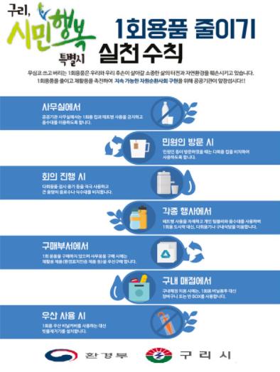 구리시는 12월 1일부터 그린뉴딜 정책의 일환으로 시 본청, 사업소, 각동, 산하기관의 모든 사무실에 1회용품 사용을 금지 및 시 주관 각종 행사와 회의 시에도 1회용품 사용을 최대한 제한하겠다고 밝혔다.
