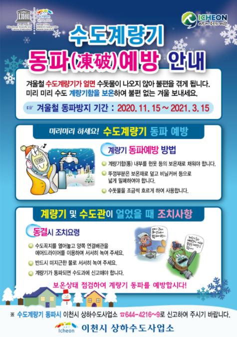 이천시상하수도사업소에서는 생활에 가장 필수적인 상수도시설을 철저하게 관리하여 시민들이 안전하고 불편함이 없도록 동절기 상수도 동파방지를 위한 홍보에 적극적으로 나섰다.