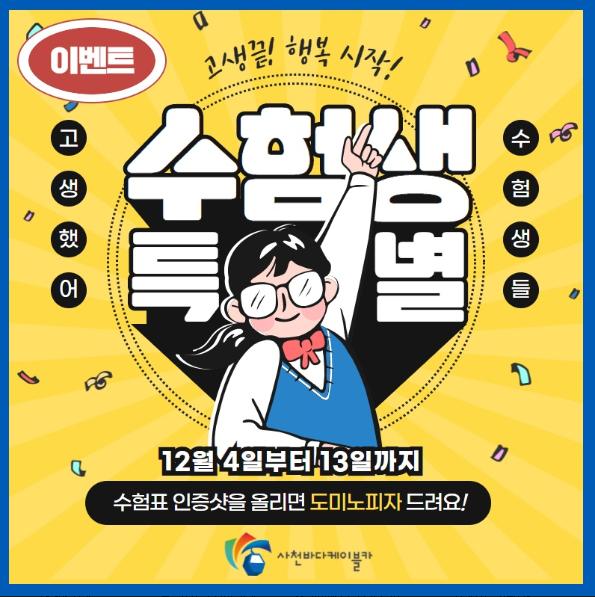 먼저, 12월 4일부터 13일까지 10일간 ?학년도 수능 기념?수험표 인증샷’이벤트를 실시한다. 참여방법은 개인정보 부분만 가리고 본인 수험표 인증샷을 찍어 본인 SNS에 올린 뒤 이벤트 게시물에 ‘참여완료’와 URL을 댓글로 남기면 된다. 사진 확인과 댓글 내용, 기타 준수사항을 평가한 후 당첨자 10명에게 3만 원 상당의 '도미노' 피자 세트를 증정한다.