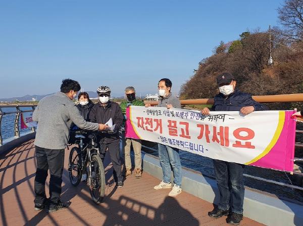 특히, 보행자들과 함께 이용하는 이곳 탐방로는 안전을 위해 자전거에서 내려 끌고 가야 하는 곳으로 달성군시설관리공단에서는 이번 캠페인뿐만 아니라 현수막, 안내판 등을 게시해 시민들에게 생태탐방로에서 자전거 끌고 가기를 홍보를 하고 있다.