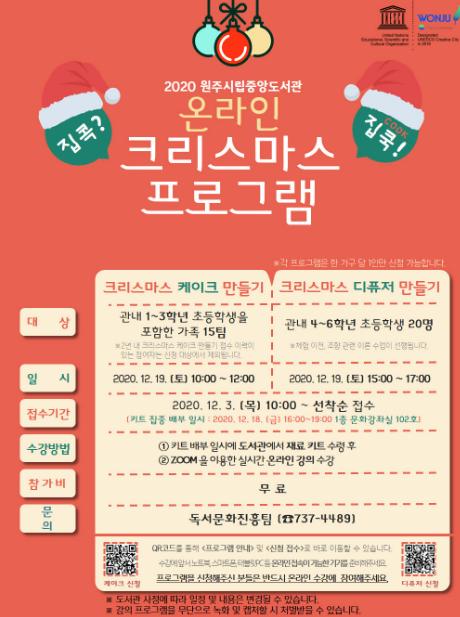 원주시립중앙도서관은 크리스마스를 맞아 오는 19일 크리스마스 케이크·디퓨저 만들기 무료 체험 프로그램을 운영한다.