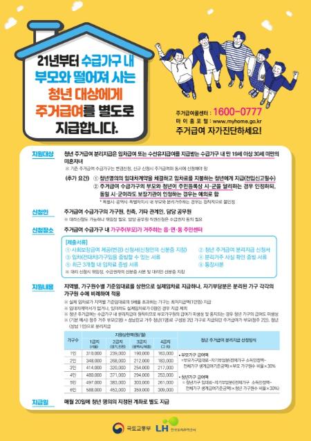 이는 국토교통부가 2021년 1월부터 부모와 떨어져 사는 저소득층 20대 청년에게 주거급여를 분리 지급하기로 한 데 따른 조치이다.