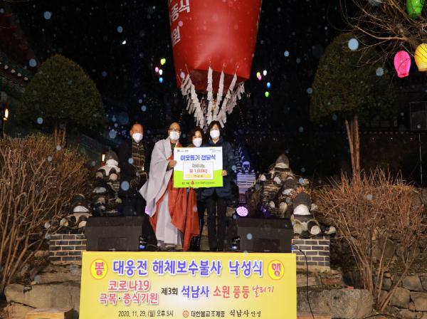 석남사 주지스님은 “이번 대웅전 낙성식을 기념하여 자비 나눔을 할 수 있어 감사하다. 코로나19로 인해 직접 가정마다 전달해 드릴 순 없지만, 저희의 마음이 잘 전달되고, 코로나19가 하루빨리 종식되기를 바란다”고 말했다.