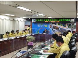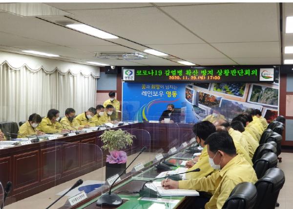 충북 영동군이 지난 29일 군청 상황실에서 코로나19 확산 방지를 위한 상황판단회의를 박세복 군수 주재로 개최했다.