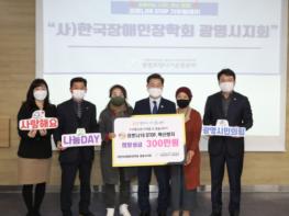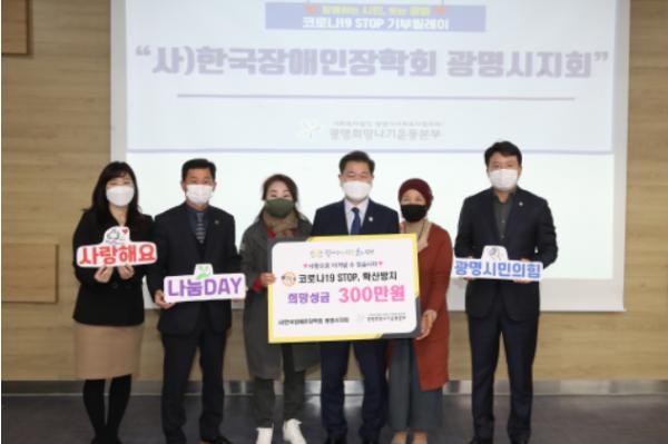 광명시는 2020년 12월1일 사)한국장애인장학회 광명시지회로부터 '코로나19 STOP' 기부릴레이 희망성금 300만원을 광명시사회복지협의회-광명희망나기운동본부에 전달하였다고 밝혔다.