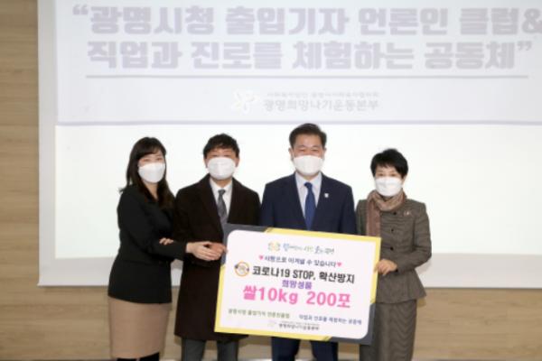 광명시는 2020년 12월1일 광명시청 출입기자 언론인 클럽과 직업과 진로를 체험하는 공동체로부터 '코로나19 STOP' 기부릴레이 희망성품 쌀 10kg 200포를 광명시사회복지협의회-광명희망나기운동본부에 전달하였다고 밝혔다.