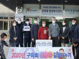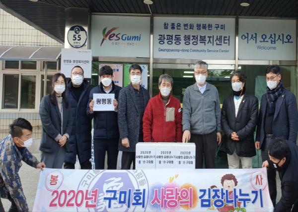 구미시 광평동에서는 2020년 11월 30일(월) 15:30 구미회에서 관내 어려운 이웃을 위해 김장김치(5kg), 9박스를 광평동 행정복지센터에 기탁했다.