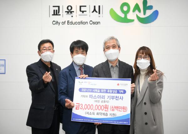 오산시는 따스아리 기부천사(회장 공흥식)에서 12월 1일 시청을 찾아 지역 저소득층을 위해 사용해달라며 지원 성금 3백만원을 기탁했다고 밝혔다.