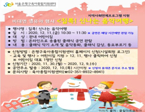 은평구는 지속되고 있는 사회적 거리두기로 움츠려 있는 어린이집 재원 영유아를 위하여 12월 11일(금) 10시 30부터 11시 30분까지 온라인으로 음악회를 선보인다.