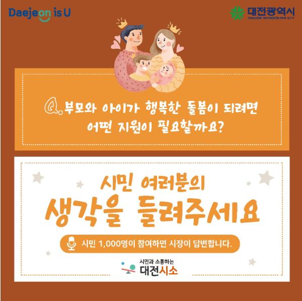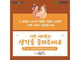 이현미 대전시 청년가족국장은 "부모와 아이가 행복한 양육 친화적인 사회 환경을 조성하고, 시민이 체감할 수 있는 돌봄 정책을 운영할 수 있도록 시민의 다양한 의견을 제시하여 주시기 바란다”고 말했다.