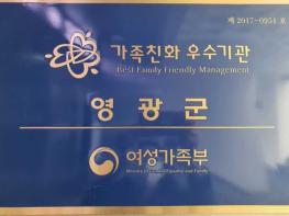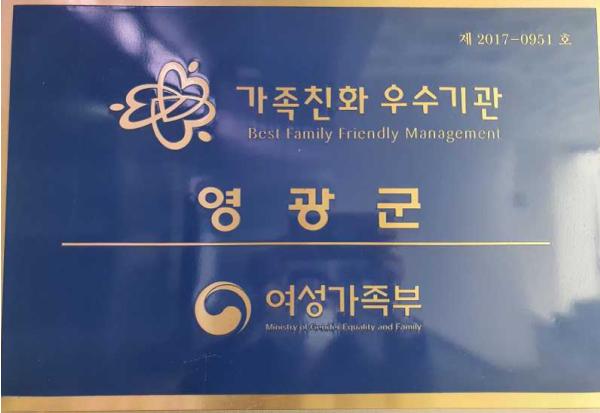 영광군은 지난 2017년 11월 가족친화인증기관 신규 인증을 받았으며, 올해 가족친화인증기관 유효기간 연장으로 2022년 11월 30일까지 가족친화인증기관의 자격을 유지하게 됐다.