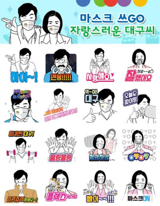 ‘자랑스러운 대구씨’ 이모티콘은 ‘마스크 쓰GO 운동’을 바탕으로 일상생활에 많이 사용하는 표현들을 재치있는 문구와 동작들로 디자인한 16종으로 구성되어 있으며, 직접적으로 메시지를 전달하기보다는 일상적인 상황을 재밌고 친근하게 표현해 시민들의 활용도를 높였다.