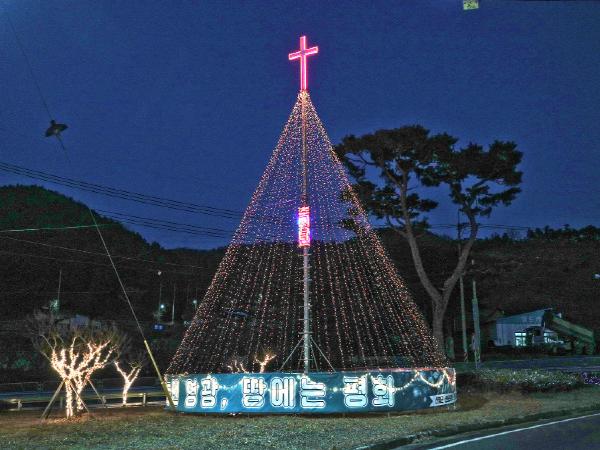 산청의 관문인 국도3호선 산청입구에 설치된 대형 성탄트리가 불을 밝혔다.