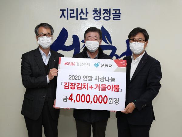 BNK경남은행 산청지점(지점장 김선호)이 2일 산청군청을 찾아 김장김치 67박스와 이불 31채(총 400만원 상당)를 기부했다.