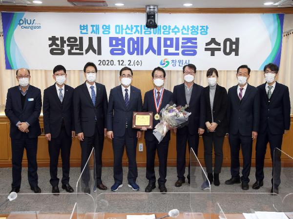 변 청장은 해양·항만·수산분야의 오랜 공직경험을 바탕으로 마산지방해양수산청장으로 재임하며 마산항 일원 각종 개발사업 등 창원지역에 산재돼 있는 주요 현안이 차질 없이 해결될 수 있도록 적극 지원했으며, 주요 현안업무 추진을 위한 협약체결을 통해 시민 불편사항 조기 해소와 지역경제 활성화에 기여한 공로가 인정돼 명예시민증을 수여받았다.