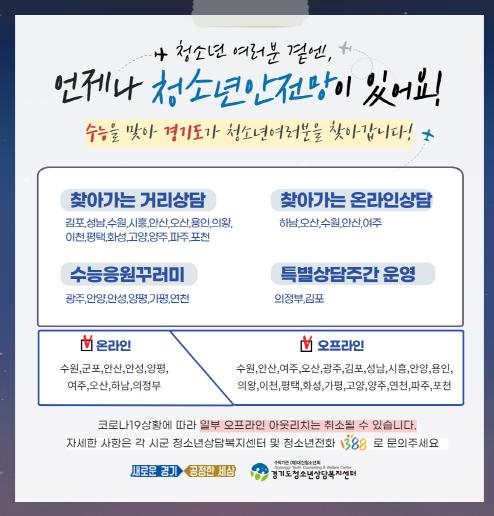 경기도는 수능전후 청소년안전망 강화를 위해 도내 청소년유관기관 47개소와 연합해 12월 11일까지 ‘찾아가는 수험생 응원’을 진행한다.