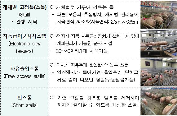 양돈농가는 임신돼지 군사 시설을 도입할 때 자동급이군사시스템(ESF), 자유출입스톨(FAS), 반스톨(SS)을 고려할 수 있다.