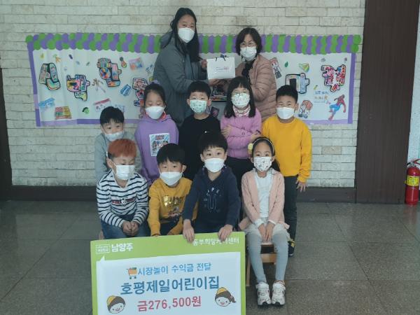 남양주시 호평동에 위치한 호평제일어린이집(원장 김귀순)은 원내에서 진행한 프리마켓 수익금 276,500원을 남양주시 동부희망케어센터에 의뢰하여 사회복지공동모금회에 기탁했다고 2일 전했다.