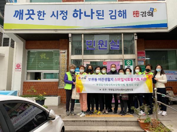 김해시 부원동 지역사회보장협의체는 지난 12월 1일 여관거주 저소득 60세대에 코로나19 극복을 위한 식료품 키트를 전달하였다.