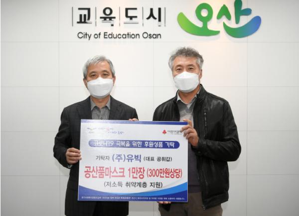 오산시는 지난 12월 1일 ㈜유빅(대표 공희갑)이 시청을 찾아 관내 저소득층을 위해 사용해 달라며 마스크 1만매를 기탁했다고 밝혔다.