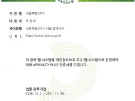 세종특별자치시가 시청 홈페이지(www.sejong.go.kr)의 개인정보보호 및 웹 접근 편의성을 인정받아 개인정보보호 인증 및 웹 접근성 인증마크를 획득했다.