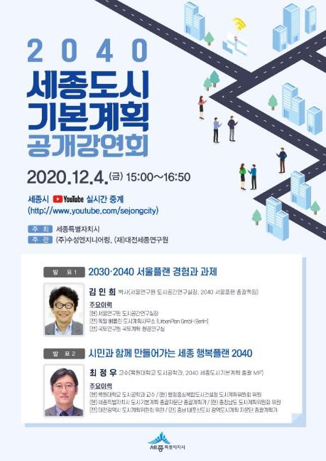 세종시는 4일 오후 3시부터 공식유튜브채널(www.youtube.com/sejongcity)을 통해 ‘시민참여형 세종도시기본계획 제1회 공개강연회’를 연다.