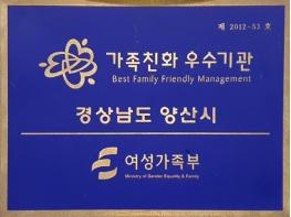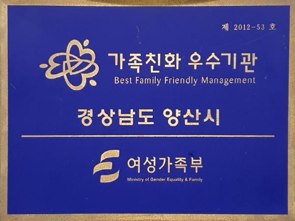 2012년 가족친화기관으로 최초 인증 받은 양산시는 2015년 유효기간연장, 2017년 재인증을 받았으며, 올해 다시 가족친화제도 모범 운영 공공기관 지위를 획득하게 되어 2023년 11월까지 가족친화기관 자격이 유지된다.