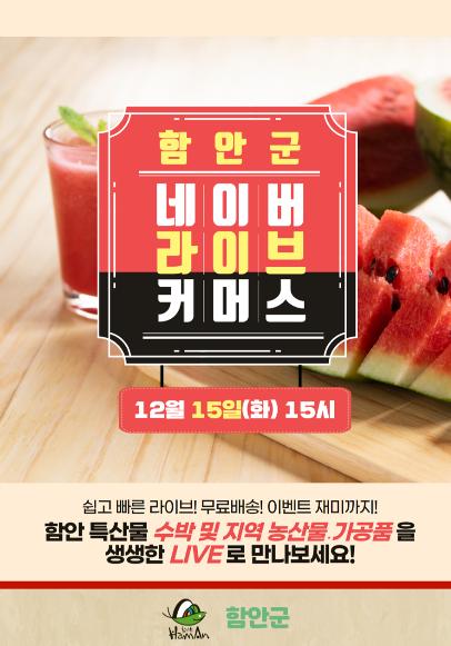 경남 함안군은 오는 12월 15일 15시 네이버 쇼핑라이브에서 처음으로 라이브 커머스를 통해 함안군의 대표 특산물인 ‘함안수박’을 비롯한 지역 농산물?가공품 판매에 나선다고 밝혔다.