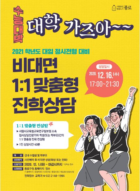 종로구는 12월 수능철을 맞아 온라인에서 비대면 방식으로 「2021학년도 대입 정시전형 대비 입시설명회·진학상담」을 실시한다.