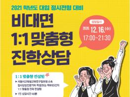 아울러 12월 16일 오후 5시부터 운영하는 ▲1:1 맞춤형 진학상담은 서울시교육청 대학진학지도지원단 소속 강사 6명이 참여한다. 비용은 전액 무료이며 관내 수험생 또는 학부모 선착순 30명의 사전예약을 받는다. 1인당 40분씩 화상 또는 전화로 개인별 컨설팅을 진행할 계획이다.