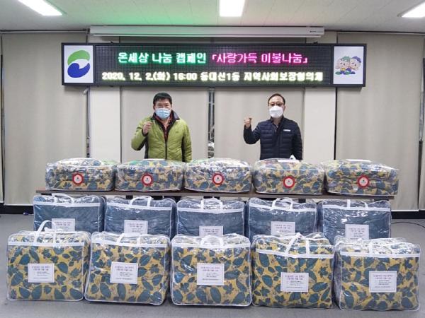 부산시 서구 동대신1동 사랑의디딤돌후원회 ㆍ 지역사회보장협의체(위원장 손외권)는 지난 2일, 추운 겨울 난방이 취약한 저소득 소외계층 22세대에 온(溫)세상 나눔 캠페인의 일환으로 사랑가득 이불을 전달하며 따뜻한 온기를 전하였다.