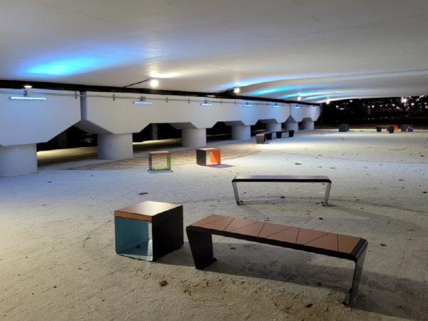 신천변에는 야간에도 조깅, 자전거하이킹 등 많은 사람들이 이용하는 점을 고려하여 기존 보안등 외에 추가로 경관조명을 설치하였으며, 이 경관조명은 시간대별로 컬러체인지가 되어 이색적인 공간체험이 가능하도록 하였으며 천정을 투과하는 간접조명 방식으로 편안하고 쾌적한 공간으로 꾸몄다.