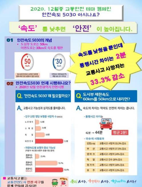 12월 인천광역시에서 전면시행될 ‘안전속도 5030’정책의 조기 정착을 위해 서구청은 9월에 이어 12월 교통안전테마캠페인 주제로 안전속도 5030을 선정하고, “‘속도’를 줄이면 ‘안전’이 높아집니다”라는 주제로 반상회 홍보자료 배포, LED 전광판 표출 등으로 안전속도 5030 홍보 활동에 나선다.