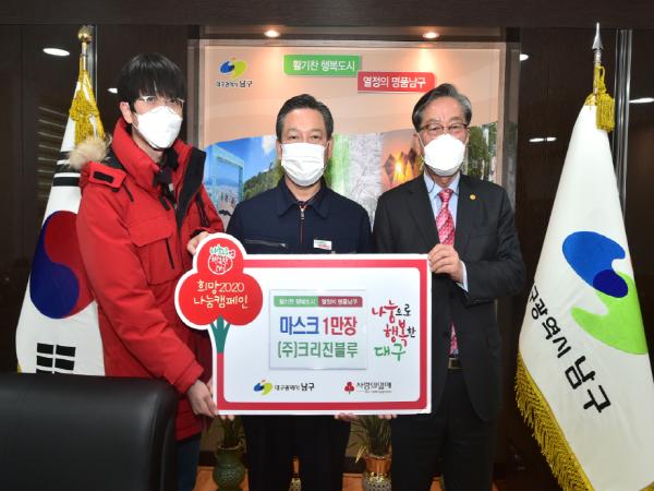 대구광역시 남구청은 지난 2일, ㈜크리진블루(대표 김대희)에서 어려운 이웃을 위해 KF94 마스크 1만매를 기탁했다고 밝혔다.