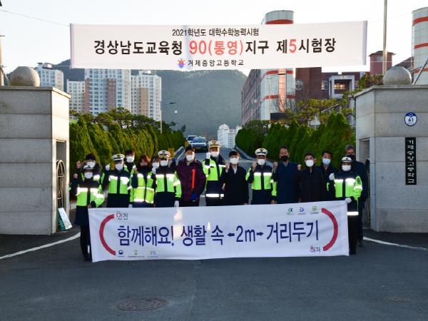 거제경찰서, 모범운전자회 거제지회 및 새마을교통봉사대와 합동으로 실시한 교통지도는 학생들의 입실시간인 오전 8시 10분까지 진행되었며, 총 60여 명이 수험장 주변 교통정리와 주차안내 및 차량서행 지도 등 수험생이 원활하게 시험장에 입실할 수 있도록 지원했다.