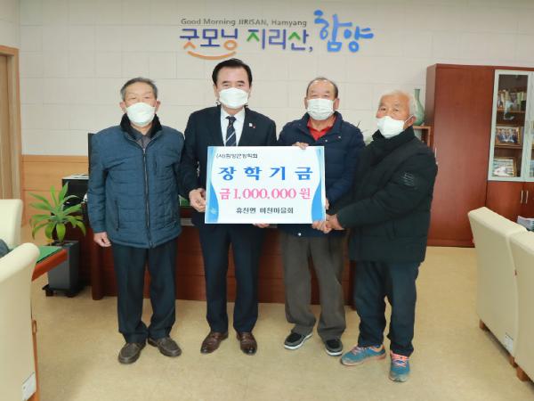 (사)함양군장학회는 12월 3일 휴천면 미천마을회로부터 마을주민들의 따뜻한 마음이 모인 장학금 100만원을 기탁 받았다고 전하였다.