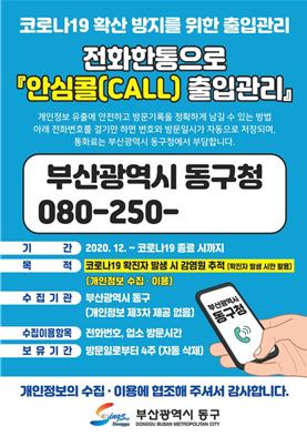 부산 동구는 부산시 사회적 거리두기 2단계 격상 및 3차 팬데믹에 대비하고, 코로나19 지역사회 확산 최소화 및 신속한 감염원 확인을 위해 오는 7일부터 무료 080전화 ‘안심콜 출입관리서비스’를 동구 관내 전역으로 확대 실시한다고 밝혔다.