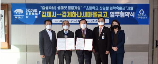시에 따르면 김제시(시장 박준배)와 김제하나새마을금고(이사장 박종권)는 지난 2일 김제시청 소회의실에서 3년차 계속사업인 “출생축하 생애 첫 통장 개설 사업”과 신규사업인“초등학교 신입생(둘째아) 입학 축하금 지원”을 위한 협약을 체결했다고 밝혔다.