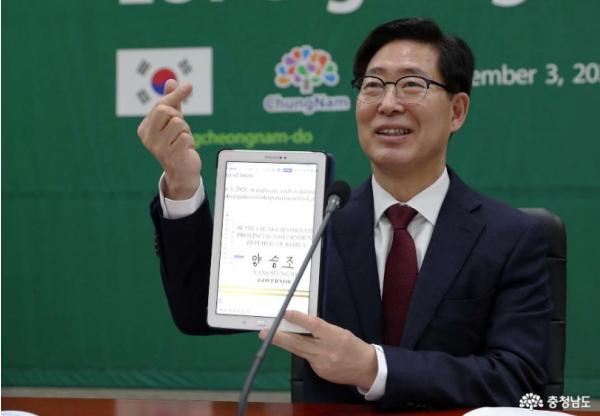 양승조 지사는 3일 도청 대회의실에서 온라인을 통해 리드완 카밀 서자바주지사와 국제교류협력의향서(LOI)를 체결했다.