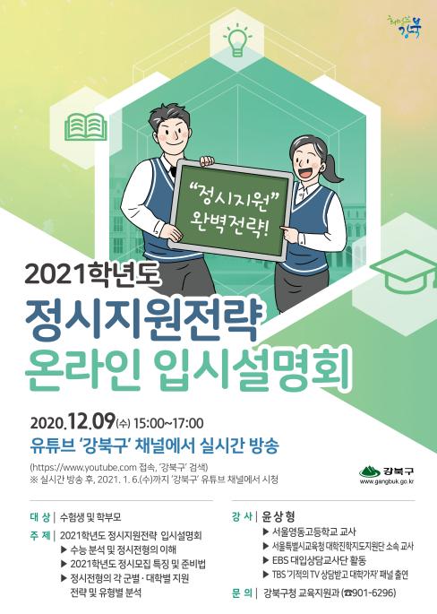 강북구가 12월 9일(수) ‘2021학년도 정시지원전략 온라인 입시설명회’를 개최한다.