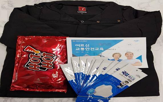 이번 지원물품은 반사띠가 부착된 방한복 한 벌과 마스크 및 핫 팩 각각 10개씩이다. 함께 배부되는 교육자료에는 어르신들이 수집활동 중 유의해야 할 안전수칙 및 교통사고 예방법 등이 실려 있다.