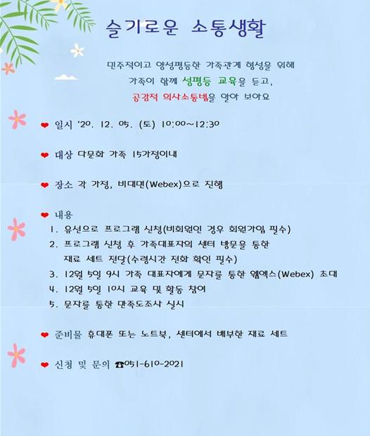 이번 교육은 다문화가족의 평등한 가족 관계 확립 및 민주적이고 공감적인 의사소통법 습득을 목표로 하며, 화상 프로그램 ‘웹엑스(Webex)’를 통해 온라인으로 진행된다.