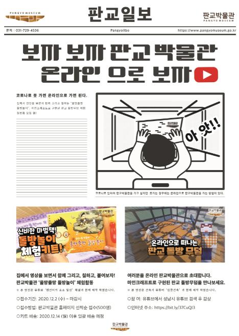 판교박물관 홈페이지의 ‘교육 및 행사- 교육예약 - 초등프로그램’에서 신청 가능하며, 오는 14일 이후 순차적으로 우편 배송될 예정이다. 자세한 사항은 판교박물관(☎031-729-4536)로 문의하면 안내받을 수 있다.