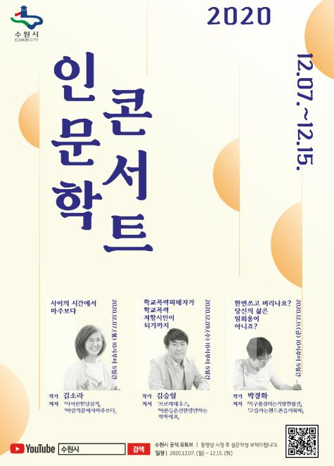 수원시가 작가·시인 등의 인문학 강연을 들을 수 있는 ‘2020 인문학 콘서트’를 7일부터 18일까지 온라인으로 연다.
