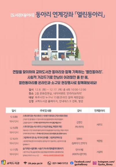 파주시 교하도서관은 연말을 맞이해 코로나19 상황으로 장기간 만남이 어려웠던 도서관 동아리와 함께 열린동아리 강좌를 진행한다.