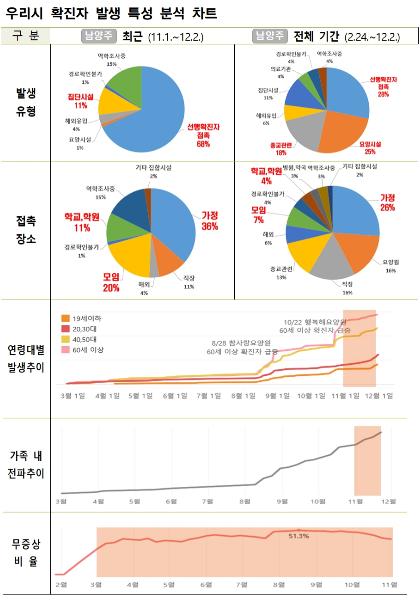이번 분석결과에 따르면 지난 10월 이후부터 40세 이상 연령층의 확진비율이 급격한 상승곡선을 그리고 있으며, 이들이 직장ㆍ사적모임에서의 접촉을 통한 확진으로 무증상 상태에서 가족 간 전파를 유발하고 전파된 가족이 연쇄적으로 n차 감염을 일으키면서 이를 통해 지역 내 감염이 확산되고 있는 것으로 확인됐다.