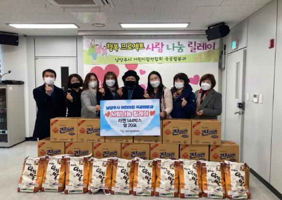 이날 전달된 물품은 지역사회 소외계층을 위해 진행한 행복프로젝트로 마련됐으며, 특히 남양주시어린이집연합회 국공립분과 소속의 72개소 어린이집이 전부 참여하여 각각 라면 2박스에 해당하는 금액을 모아 라면을 구입하고 연합회 차원에서 쌀 20포를 준비하여 더욱 뜻깊은 나눔이 됐다.