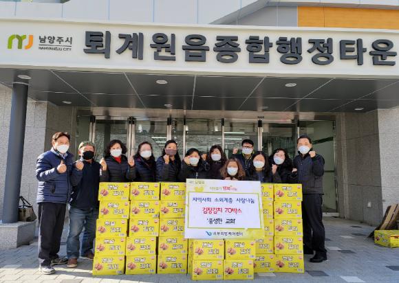 남양주시 퇴계원읍에 소재한 풍성한 교회(목사 김정희)는 지난 3일 읍사무소 관계자 및 퇴계원읍 지역사회보장협의체 위원 약 10여 명이 참여한 가운데 퇴계원읍 종합행정타운에서 김장김치 70박스 나눔 행사를 실시했다.